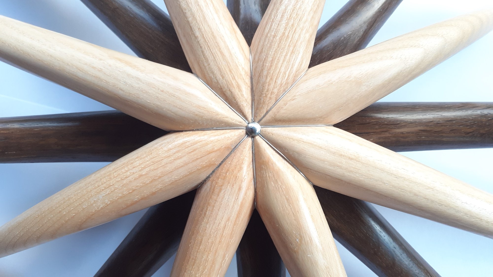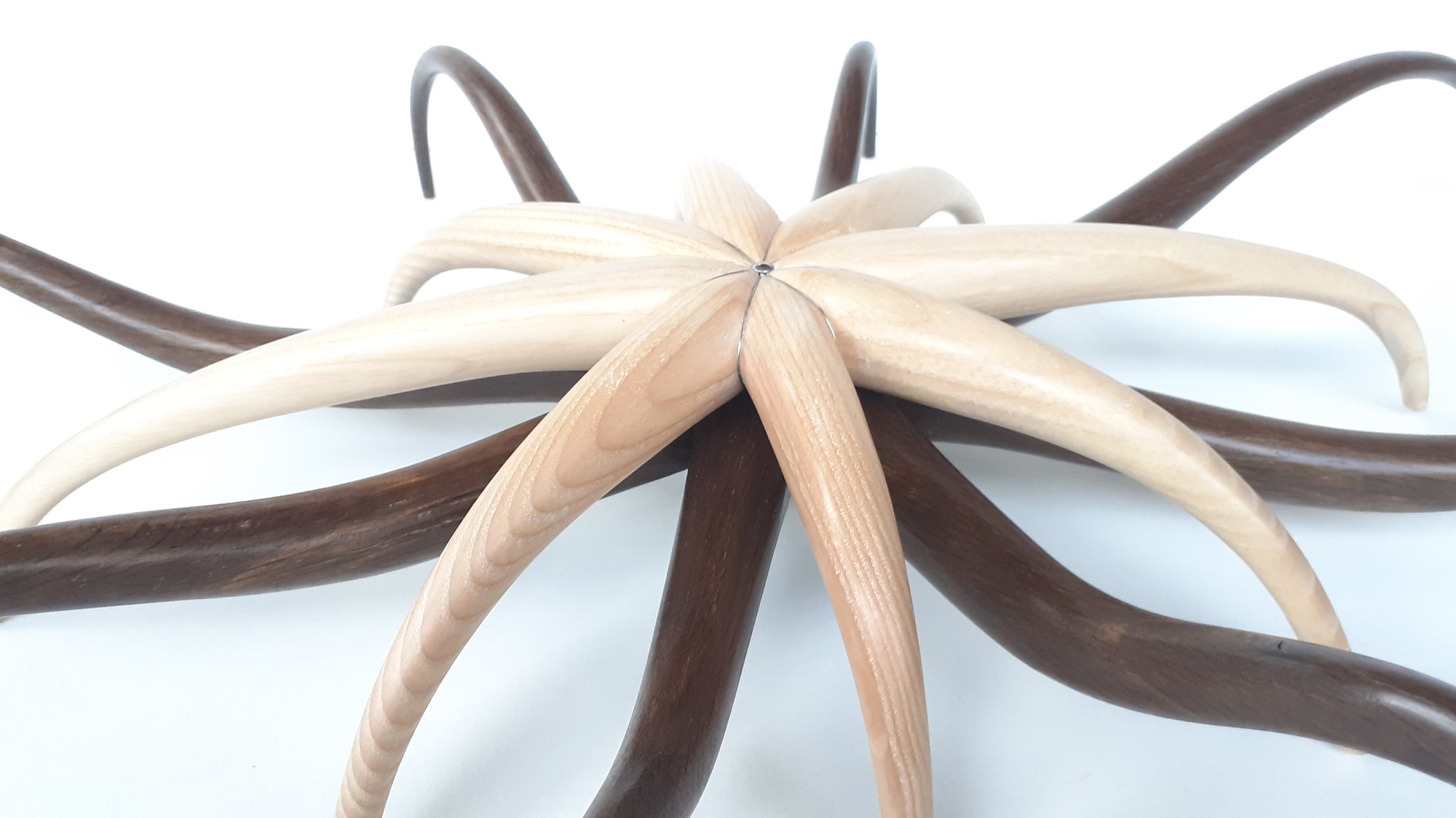 Un contraste pur entre la profondeur du chêne fumé et la clarté du frêne. Travail de la courbe et du mouvement.